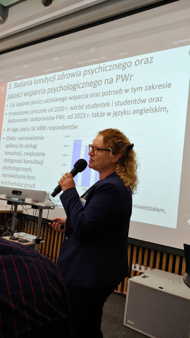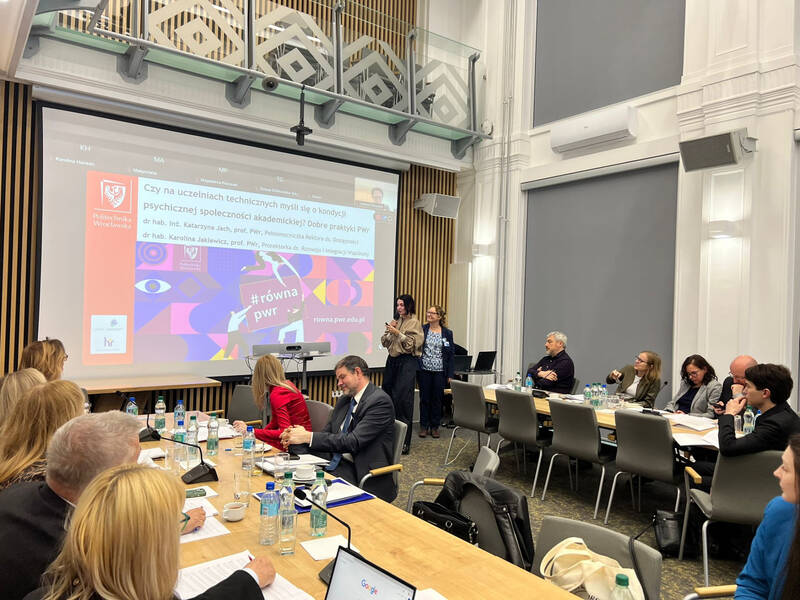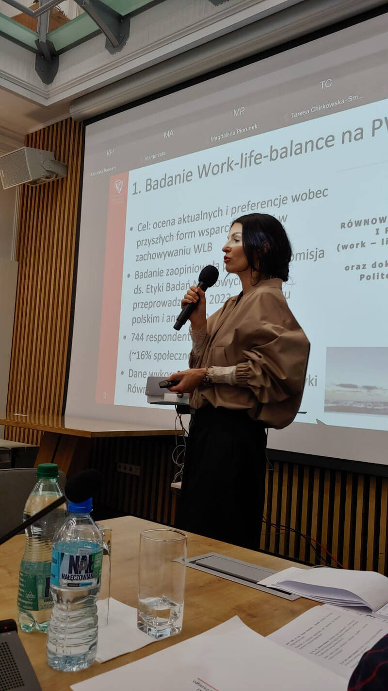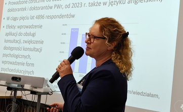 Profesor Karolina Jaklewicz wraz z Profesor Katarzyną Jach zaprezentowały dotychczasowe doświadczenia i wybrane dobre praktyki z zakresu dbania o kondycję psychiczną społeczności akademickiej na naszej Uczelni, m.in. badania work-life balance, Politykę Równości, Różnorodności i Dobrostanu czy Kampanię "Złap balans". Opowiadały również o programie grantów wewnętrznych "Rodzice do nauki!" oraz o działaniach Liderów Dostępności.